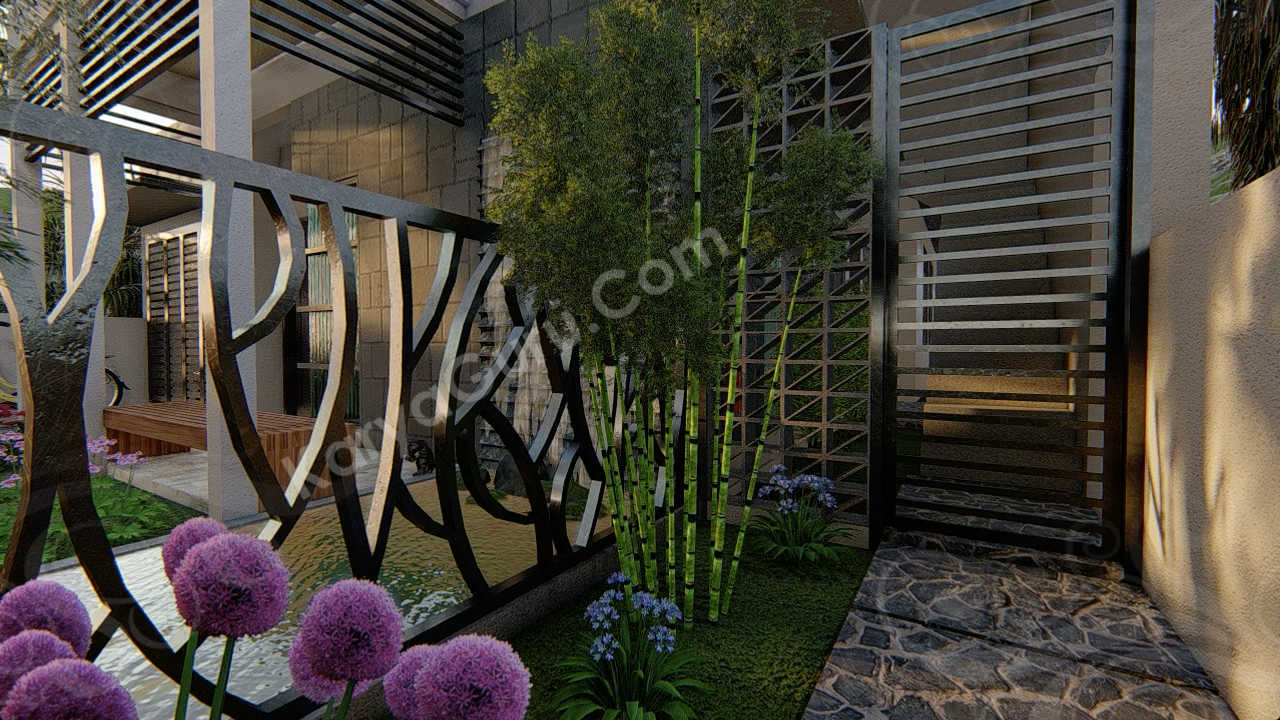 Pada bagian depan rumah terdapat kolam ikan + waterfountain, bersebelahan dengan taman sehingga memberikan rasa nyaman bagi penghuninya.