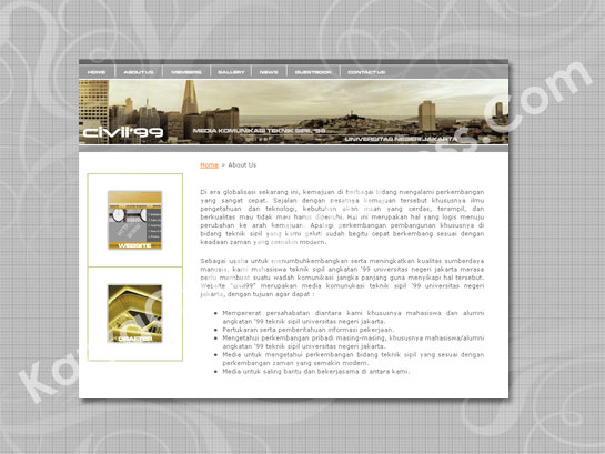 Sedangkan Web berikut ini dibuat untuk kepentingan mahasiswa jurusan teknik sipil Univ. Negeri Jakarta, khususnya angkatan 99 sebagai tempat berkomunikasi secara online. Dengan desain masih menggunakan html dan javascript serta beberapa fasilitas gratis dari situs-situs yang menyediakan contact form dan guestbook pada saat itu. Hostingnya pun numpang di geocities.com. Karena  selaku mahasiswa, kami tidak mempunyai data khusus untuk membiayai pengadaan website, maka secara bersama-sama membuat dan mengupdate content.