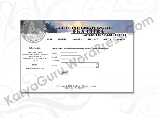 satu lagi web community versi jadul yang pernah digunakan sebagai media informasi bagi Mahasiswa Pencinta Alam – EkaCitra yang bersekretariatan di kampus Univ. Negeri Jakarta. Tidak jauh berbeda dengan web yang kedua hanya saja penggunaannya tidak terlalu aktif karena para anggotanya lebih aktif di lingkungan alam daripada di dunia online. Maklumlah waktu itu para teman mahasiswa saya masih jarang yang bermain didunia maya (menurut saya..).