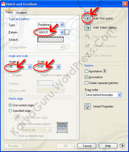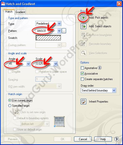 Kemudian Buatlah asiran pada area bawah atap menggunakan perintah Hatch dan sesuaikan settingannya dengan ketentuan sebagai berikut: