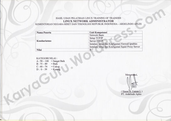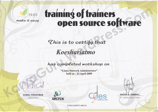 Sebagai bahan informasi, waktu itu diakhir pelatihan TOT OSS 2009 diadakan ujian untuk penilaian di sertifikatnya. Bentuk sertifikat yang saya dapat dari pelatihan TOT OSS tahun lalu seperti dibawah ini (klik pada gambar untuk lebih jelas):