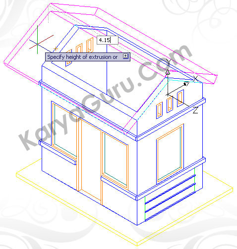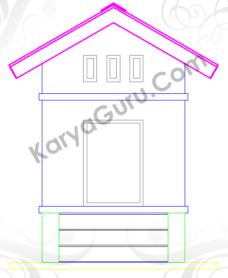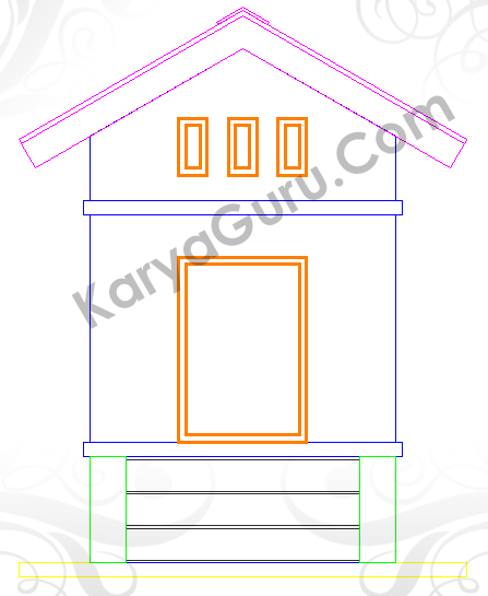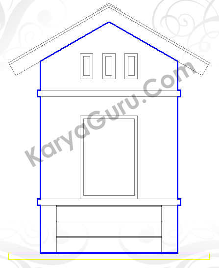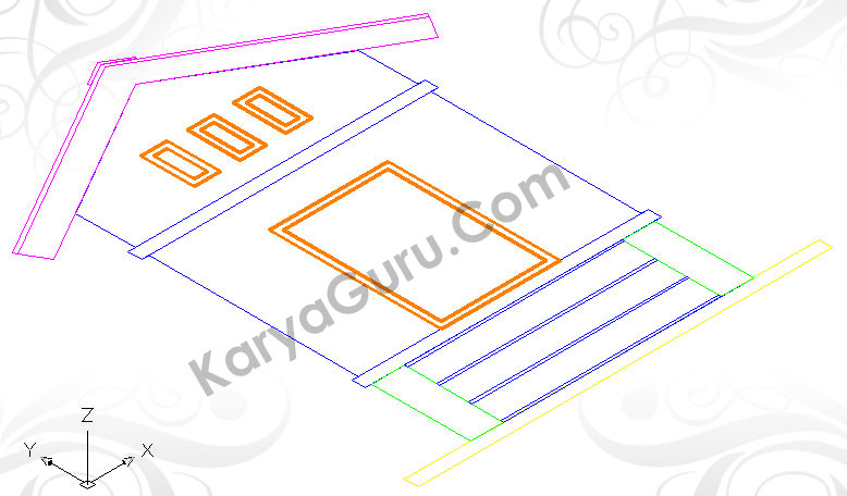 Aktifkan layer 3D-Atap buat garis atap dengan perintah Polyline. Terdapat 3 buah obyek pada bagian atap yaitu bagian papan listplank, genteng dan nok. Jadi garis polyline-nya harus membuat 3 obyek tersebut dan berarti terdapat 2 garis yang bersebtuhan pada pertemuan antara papan listplank-genteng serta genteng-nok. Intinya tidak boleh membuat garis polyline yang terputus !