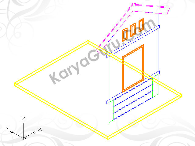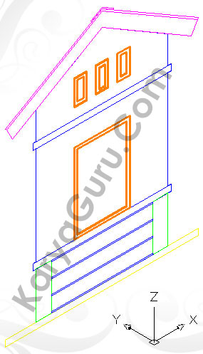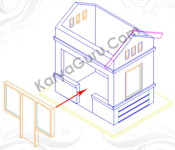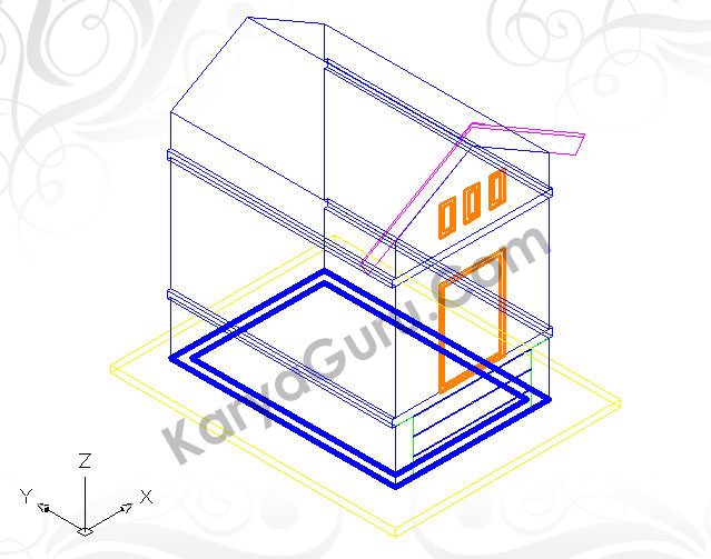 Untuk pembuatan kusen pintu dan jendela bagian depan, Lakukan langkah seperti pembuatan kusen jendela samping. Sebagai obyek untuk melubangi dinding bagian depan Anda dapat membuat garis polyline mengelilingi kusen depan. Bila sudah jadi putar obyek kusen depan dengan menggunakan perintah 3drotate menggunakan sumbu Y sebagai poros putarannya.
