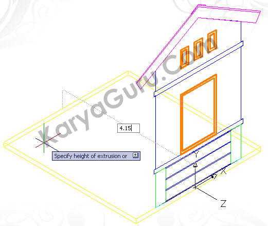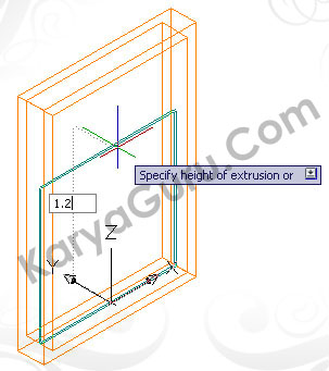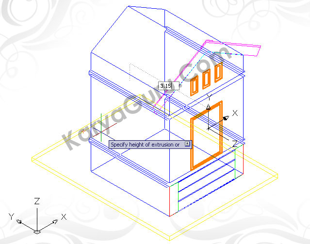 Aktifkan layer 3D-Dinding cat kemudian gunakan perintah Extrude untuk membuat obyek dinding 3 dimensi dengan ketinggian 3,15 dan diarahkan kebagian Kiri.