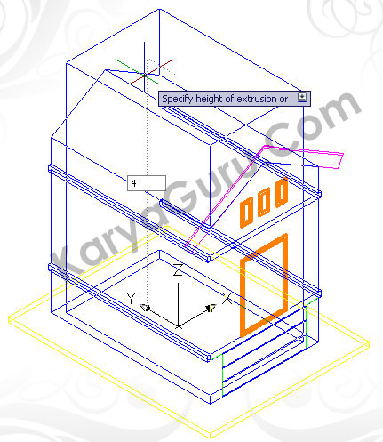 Aktifkan layer 3D-Lantai kemudian gunakan perintah Extrude untuk membuat obyek lantai 3 dimensi dengan ketinggian 4,15 dan diarahkan kebagian Kiri.