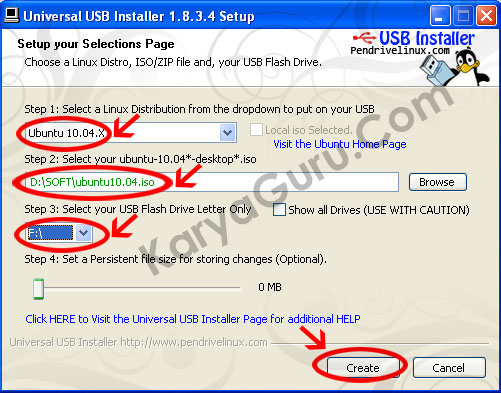 - Pilih distro linux yang diinginkan kemudian tentukan lokasi file iso dan drive flashdisk. Jika sudah merasa yakin benar silahkan melanjutkan dengan mengklik tombol Create, maka proses mengcopy file-file linux akan berjalan.
