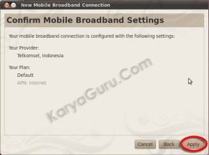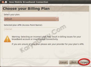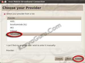Pilih provider yang digunakan, karena saya pake kartu telkomsel flash maka dipilih Telkomsel. Tekan tombol Forward untuk konfigurasi, saya memilih Default.