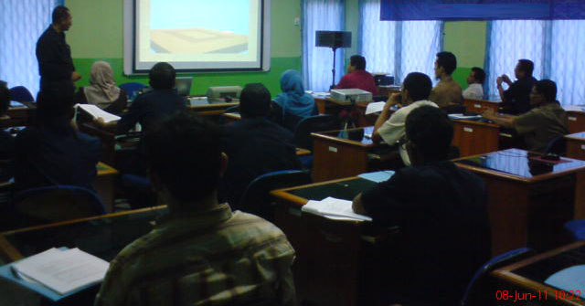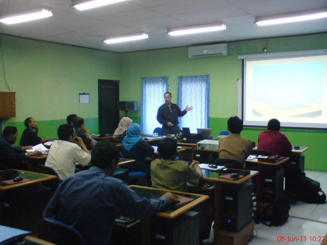 Pelatihan masih berlangsung sampai minggu depan dan lokasinya bertempat di PusLatDikJur Pulo Gadung. Materi yang disampaikan mulai dari tahap pengenalan sampai animasi. Ternyata di dunia pendidikan Google Sketchup belum banyak dipakai untuk media pembelajaran. Padahal selain software ini gratis, pembuatan obyek 3 dimensinya pun sangat cepat. Kalau dihitung-hitung perihal waktu dan biaya yang dikeluarkan dalam proses belajar mengajar akan sangat jauh berkurang karena peserta didik tidak harus terjun langsung ke lokasi benda aslinya melainkan dapat memahami dari bentuk 3 dimensi yang sangat detail. Apalagi ditambah penjelasan yang dibuat dengan animasi.. kayanya tambah menarik buat proses belajar mengajar. Sekalian saja siswa di kasih softwarenya dan ditugaskan untuk mendesain bentuk sesuai imajinasi mereka. Jadi ga kebatas dengan bentuk yang sudah umum di sekeliling mereka saja.