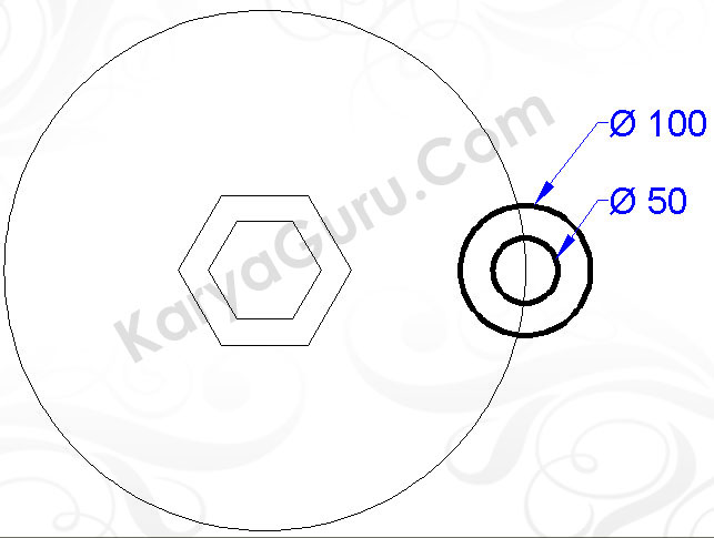Buat 2 buah lingkaran dengan menggunakan perintah Circle di sisi kanan lingkaran dengan diameter 50 dan 100