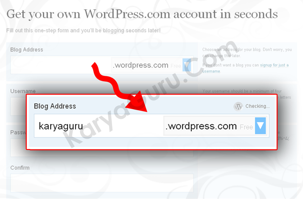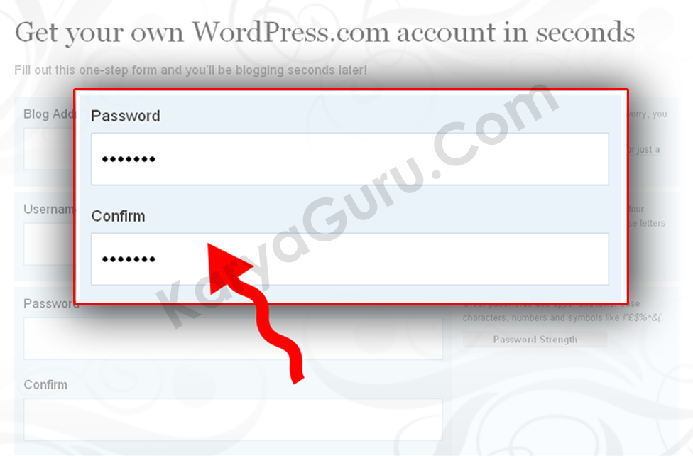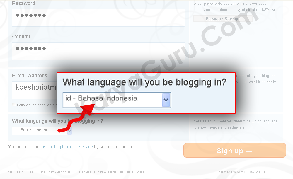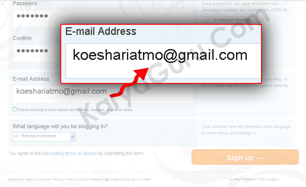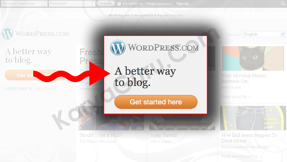 Buka website http://wordpress.com untuk mendaftar secara gratis. Dibagian kiri halaman website temukan tombol “Get started here”. Silahkan klik tombol berwarna orange tersebut.