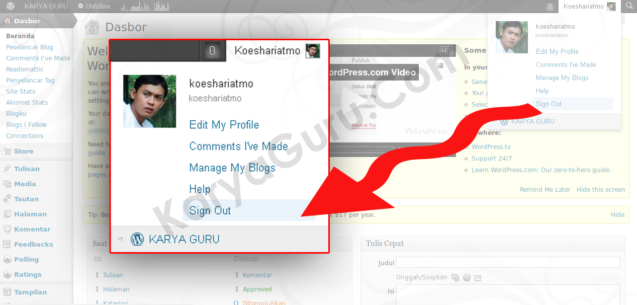 Anda akan melihat tampilan Dashboard . Untuk keluar dari area Admin, arahkan kursor mouse ke bagian kanan atas yang bertuliskan nama username Anda. Maka akan muncul tampilan seperti gambar dibawah ini. Silahkan klik “Sign Out”