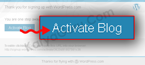 Silahkan buka email Anda, temukan kiriman email dari wordpress. Klik tombol “Active Blog” untuk proses aktivasi.