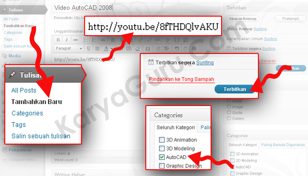 Buatlah tulisan baru pada halaman administrator blog Anda dengan mengklik “Tulisan” kemudian klik “Tambahkan Baru”. Silahkan “Paste” kode yang sudah Anda copy di kode video youtube. Tentukan kategori dari tulisan baru ini dan untuk mengakhiri klik tombol “Terbitkan”.