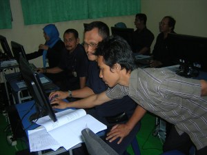 Sebetulnya pelatihan intinya adalah hari ini, karena pada pertemuan pertama hanya materi pendahuluan agar para peserta pelatihan tidak langsung disuguhi oleh materi teknis yang agak memeras konsentrasi. Pada 2 minggu ke depan kembali akan diakan pelatihan lanjutan yang lebih fokus pada pengisian data yang valid dimulai dari data siswa, jadwal, materi pelajaran, soal ujian sampai uji coba pelaksanaan tes e-learning dengan menghasilkan nilai secara akurat.