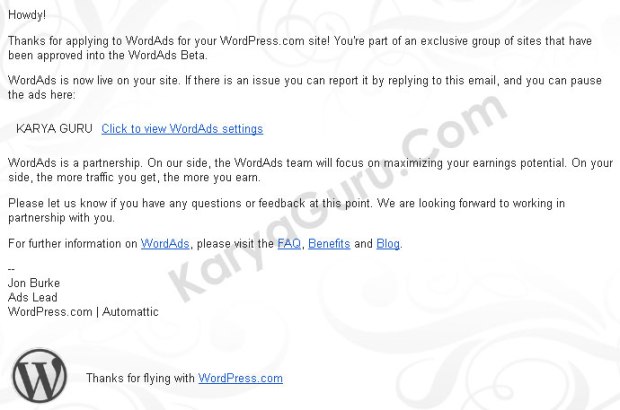 Baru saja buka email, seperti biasa banyak email baru yang masuk. Namun ada yang berbeda dengan salah satu judul email yang ada " Welcome to WordAds". Karena penasaran langsung klik judul tersebut... waaaah ternyata KaryaGuru.Com terpasang WordAds dari WordPress. Senengnya!!!!
