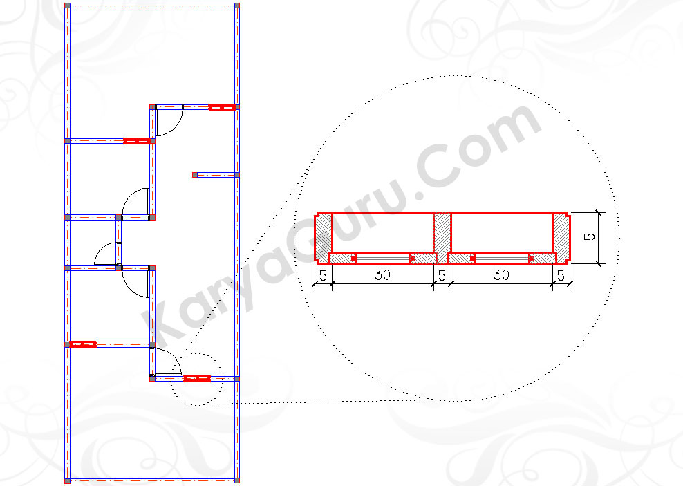Buat obyek KUSEN PINTU (warna merah) dengan bentuk dan ukuran sesuai gambar, kemudian letakan pada denah yang ada. Dalam proses pembuatan obyek ini, perintah draw yang dapat digunakan antaralain:  LINE, POLYLINE, RECTANGLE, CIRCLE, ARC. Sedangkan perintah modify yang dapat digunakan diantaranya:  COPY, MIRROR, MOVE, TRIM, ROTATE, HATCH, BLOCK.