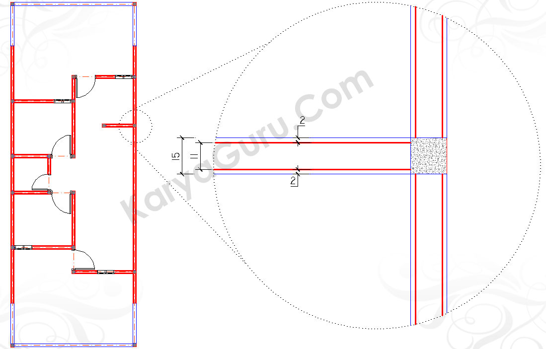 Buat garis DINDING PLESTERAN (warna biru) dengan bentuk sesuai gambar. Pada tahap ini, Anda dapat menggunakan perintah draw seperti LINE atau MULTYLINE atau POLYLINE atau RECTANGLE. Perintah modify dapat pula digunakan untuk menyelesaikan langkah ini, seperti OFFSET atau COPY dan TRIM.
