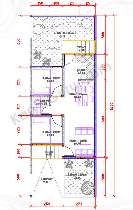 Lengkapi denah dengan obyek TANAMAN (warna merah) seperti pada gambar. Anda dapat menggunakan TOOL PALETTES – ARCHITECTURAL – TREES untuk mempermudah dalam menyelesaikan tahap ini. Gunakan perintah SCALE dan MOVE untuk mengatur posisi obyek tanaman.