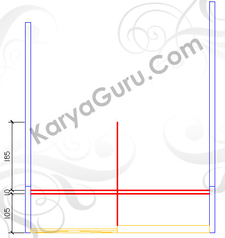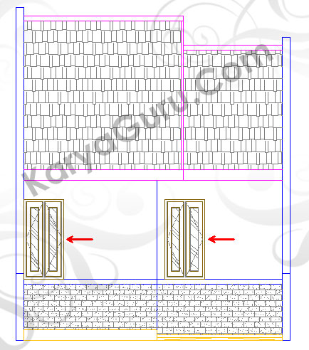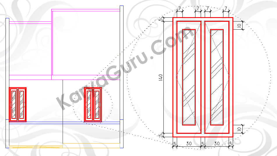 Buat obyek kusen pintu dan letakkan pada posisi sejajar dengan ketinggian kusen jendela yang ada (lihat gambar). Modifikasi garis lantai sesuai dengan garis bawah kusen pintu. Untuk langkah ini Anda dapat menggunakan perintah draw antara lain: LINE, POLYLINE dan RECTANGLE. Untuk perintah modify dapat menggunakan perintah: OFFSET, COPY, MIRROR, TRIM, ERASE, dan lainnya.