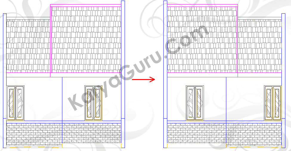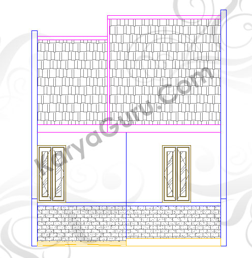 Kembali gunakan perintah HATCH untuk membuat arsiran genteng pada area atap dan arsiran batu alam pada bagian dinding bawah. Maka jadilah tampak depannya.