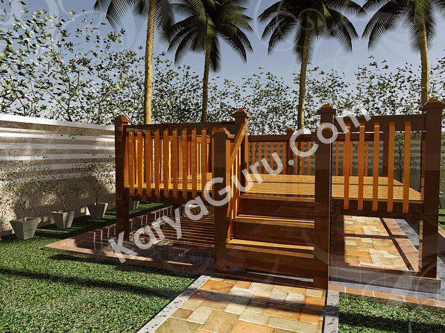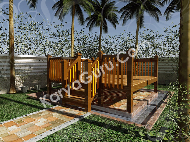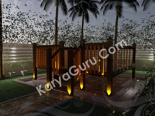 File yang diberikan, saya modifikasi pada area bawah gazebo yang dibuat kolom kecil mengelilingi obyek tersebut. Penambahan obyek lainnya, dibuat tembok dan pot tanaman serta jalan setapak. Pohon palem saya copy beberapa buah dan pohon yang satunya (ga tau pohon apa itu..), saya copy dan diletakan dibalik tembok serta beberapa di scale dan ditempatkan di pot tanaman.