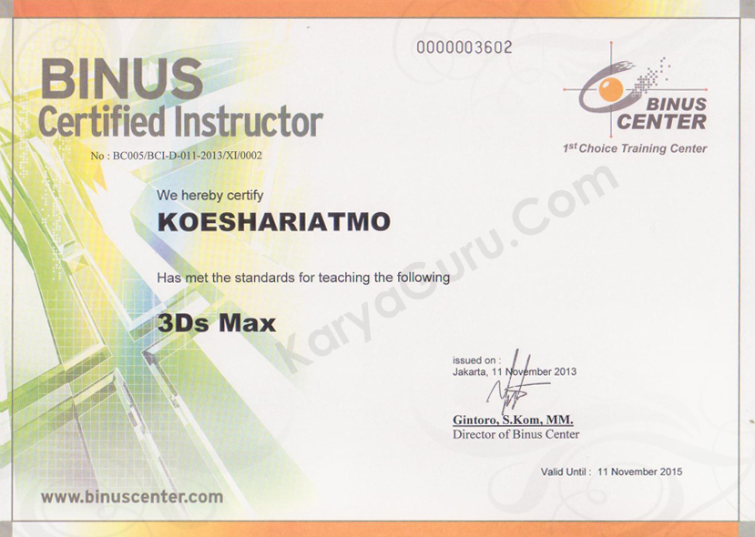 Seingat saya waktu itu saya mengambil waktu ujian 3 jam sebelum jadwal saya mengajar, supaya setelah ujian langsung masuk ke kelas. Karena soalnya dapat saya selesaikan dalam waktu 1 jam dan langsung keluar hasil nilai berkisar 91 dari 100, maka ada banyak waktu sebelum kelas saya dimulai. Dari pihak Binus Center ada tawaran untuk ikut ujian dengan materi yang lain karena ternyata setiap instruktur diberi kesempatan ujian 2x… ya saya pilih saja materinya 3DS Max… ternyata ujian 2x berturut-turut bikin kepala saya pusiiiing… Syukur kedua ujian tersebut lulus semua.