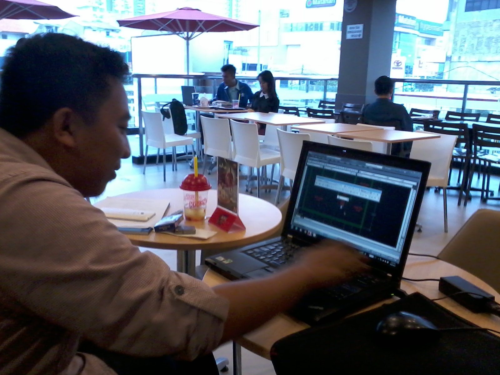 Kemarin merupakan pertemuan terakhir dari serangkaian kegiatan kursus autocad yang dilaksanakan di KFC Margonda Depok. Peserta saat ini sedang bekerja disalah satu proyek pembangunan hotel di bali dan mengambil cuti selama 1 minggu untuk belajar autocad dengan datang langsung ke depok.