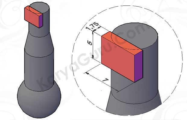 Untuk membuat lubang pada bagian yang sudah dikurangi pada hasil langkah sebelumnya, buatlah tabung seperti terlihat pada gambar (obyek warna merah) dengan ukuran diameter=7 dan panjang=3.5 . Gunakan perintah cylinder. untuk menyelesaikan langkah ini. Sebagai bantuan, gunakan perintah UCS atau aktifkan Dynamic UCS (F6) untuk mempermudah.
