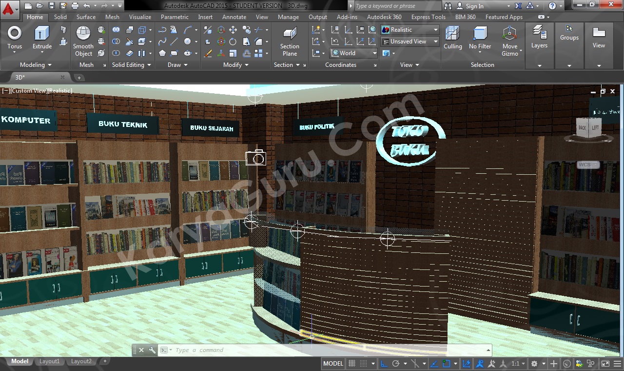 Karena peserta tidak mempunyai latar belakang teknik khususnya teknik arsitektur dalam desain interior, maka dibuat bentuk 3d model dari gambar kerja yang sudah ada yakni membahas tentang desain toko buku.