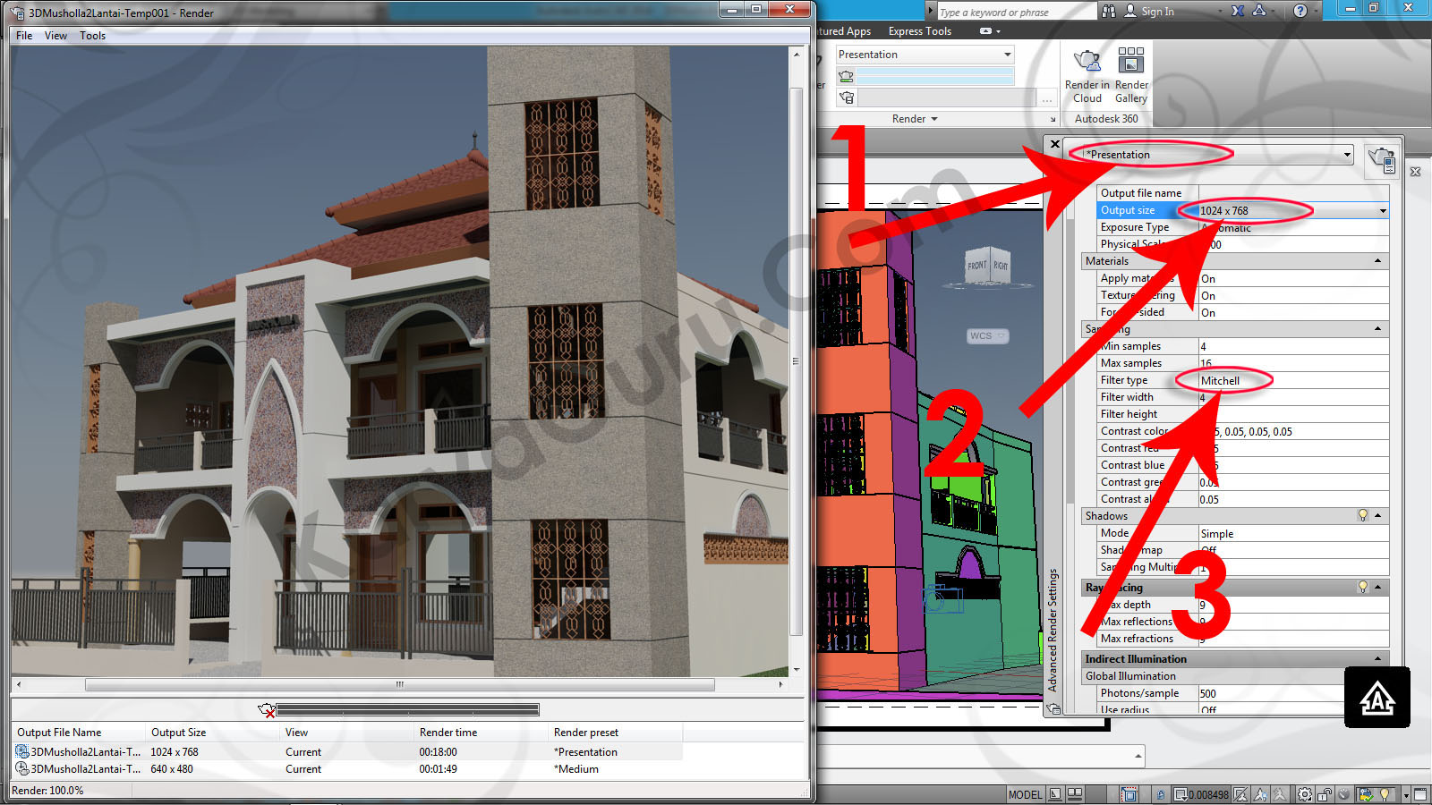 Anda juga dapat merubah beberapa hal untuk memaksimalkan hasil rendering dengan mengkonfigurasi kembali pada jendela Advanced Render Settings. Lakukan perubahan di bagian Render Preset menjadi Presentation, Output size menjadi 1024×768, dan Filter type menjadi Mitchell.