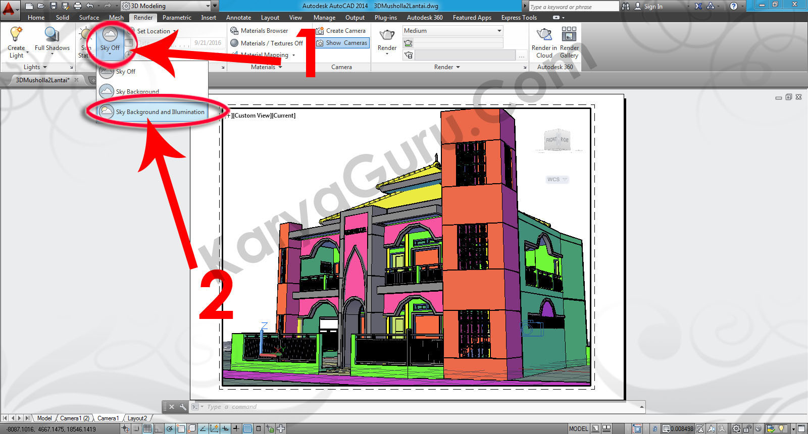 Okay kembali ke layout Camera1 dan pastikan Jendela Viewport sudah aktif dengan cara klik 2x pada area tengah. Pada ribbon pilih tab Render kemudian pilih Full Shadows pada bagian Lights.