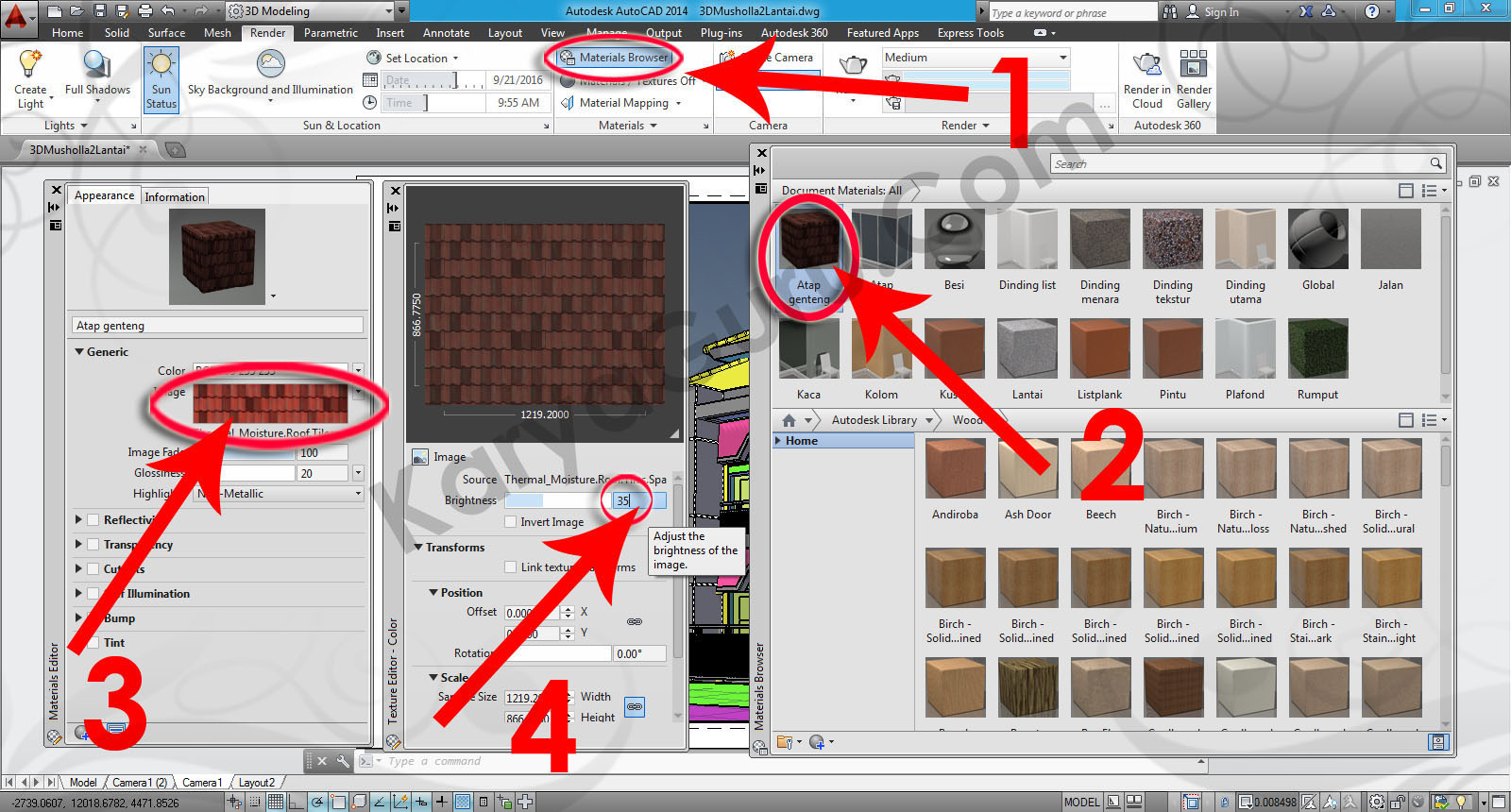Jika sudah selesai proses Rendering maka hasilnya akan terlihat beberapa kekurangan. Anda dapat merubah beberapa hal untuk memaksimalkan hasilnya seperti mengkonfigurasi kembali jenis material. Pada bagian Materials silahkan klik icon Materials Browser dan rubah settingan jenis material Atap genteng dan berikan nilai 35 untuk Brightness.