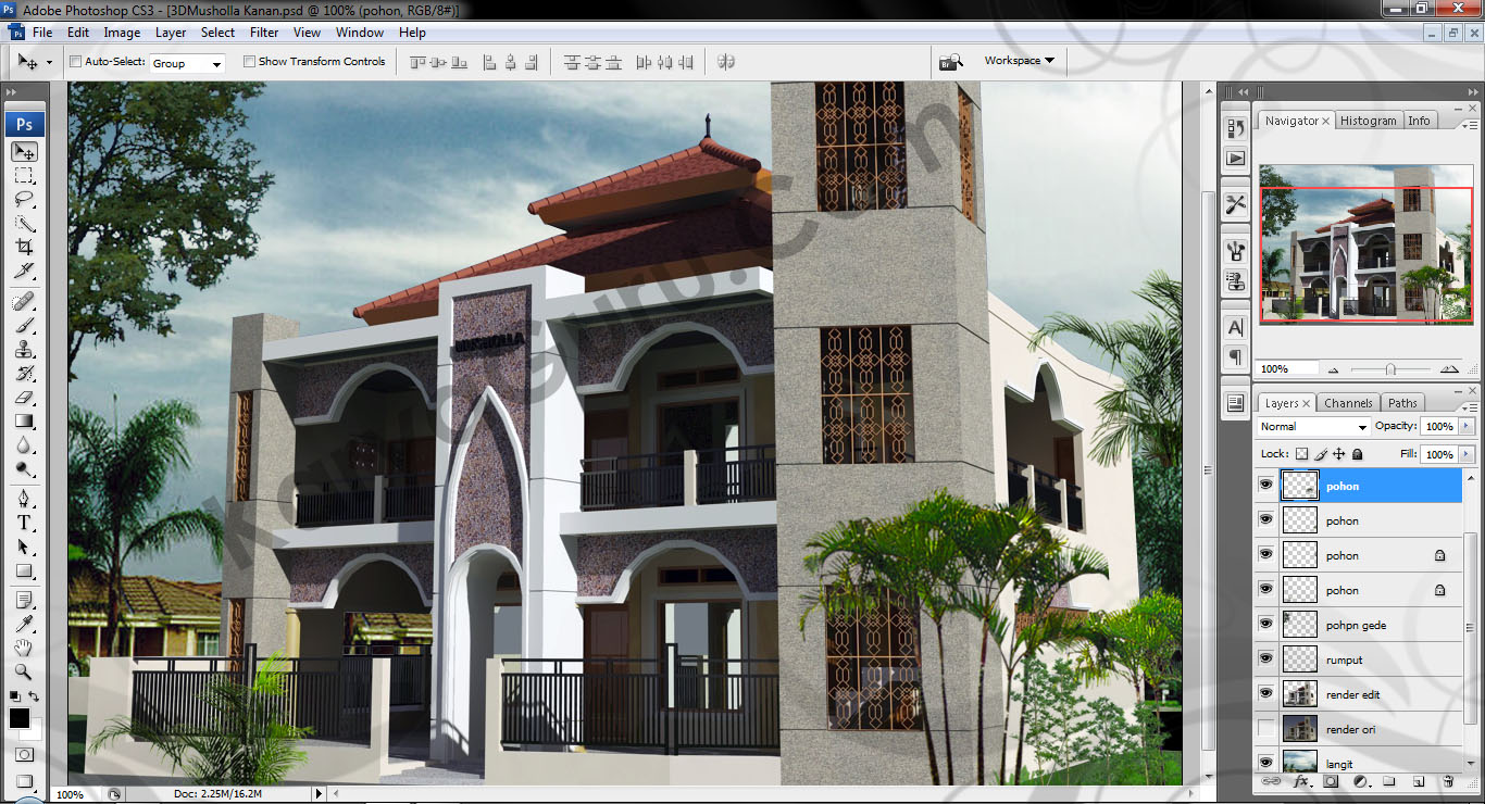 Karena pembangunan renovasi musholla ini membutuhkan dana sumbangan dari berbagai macam pihak, maka panitia membutuhkan gambar presentasi dalam bentuk 3D yang akan membantu dalam proses penggalangan dana. Dari hasil 3d rendering desain fasad dilanjutkan proses editing untuk memperhalus tampilannya sehingga layak untuk bahan presentasi.