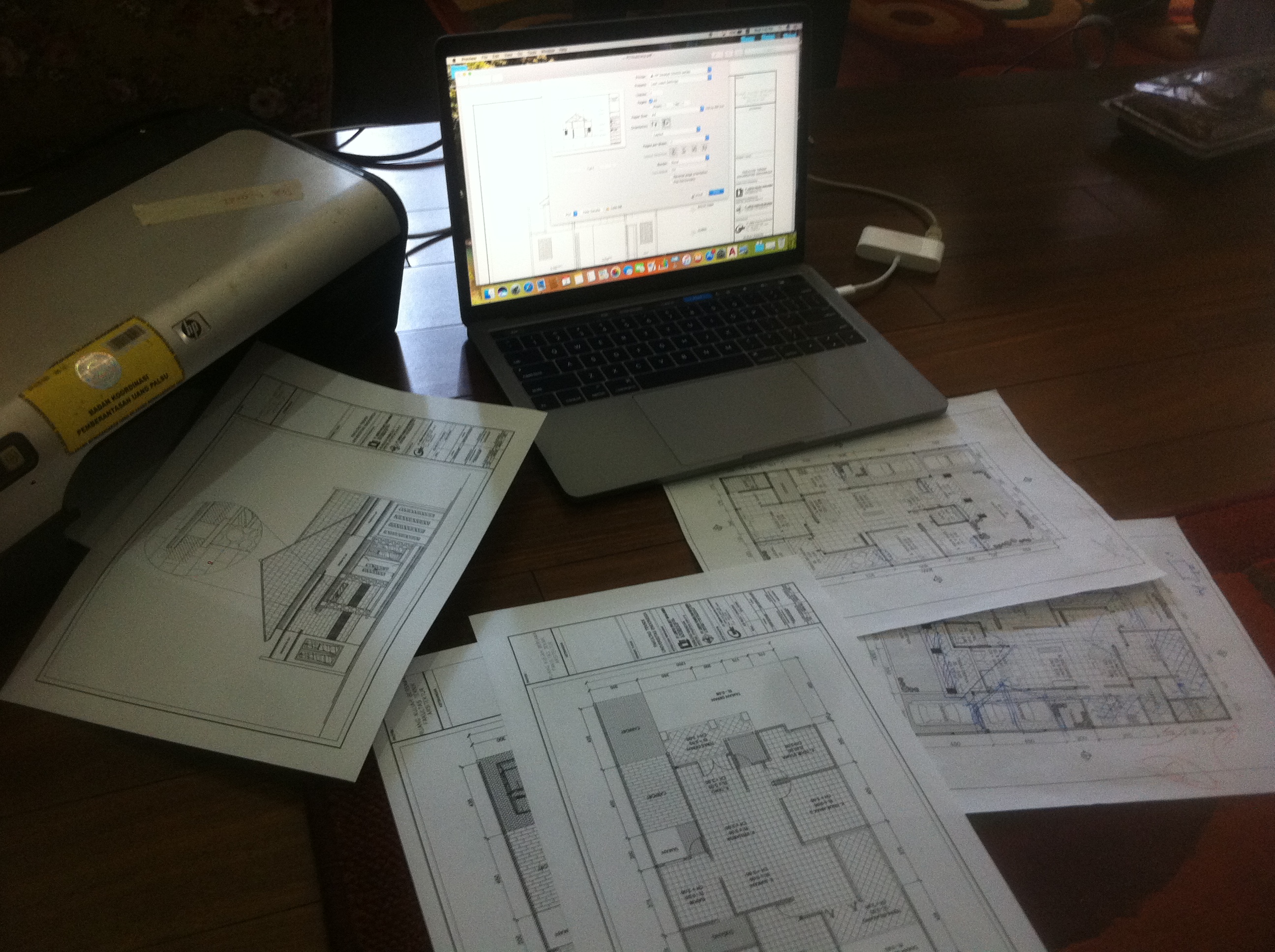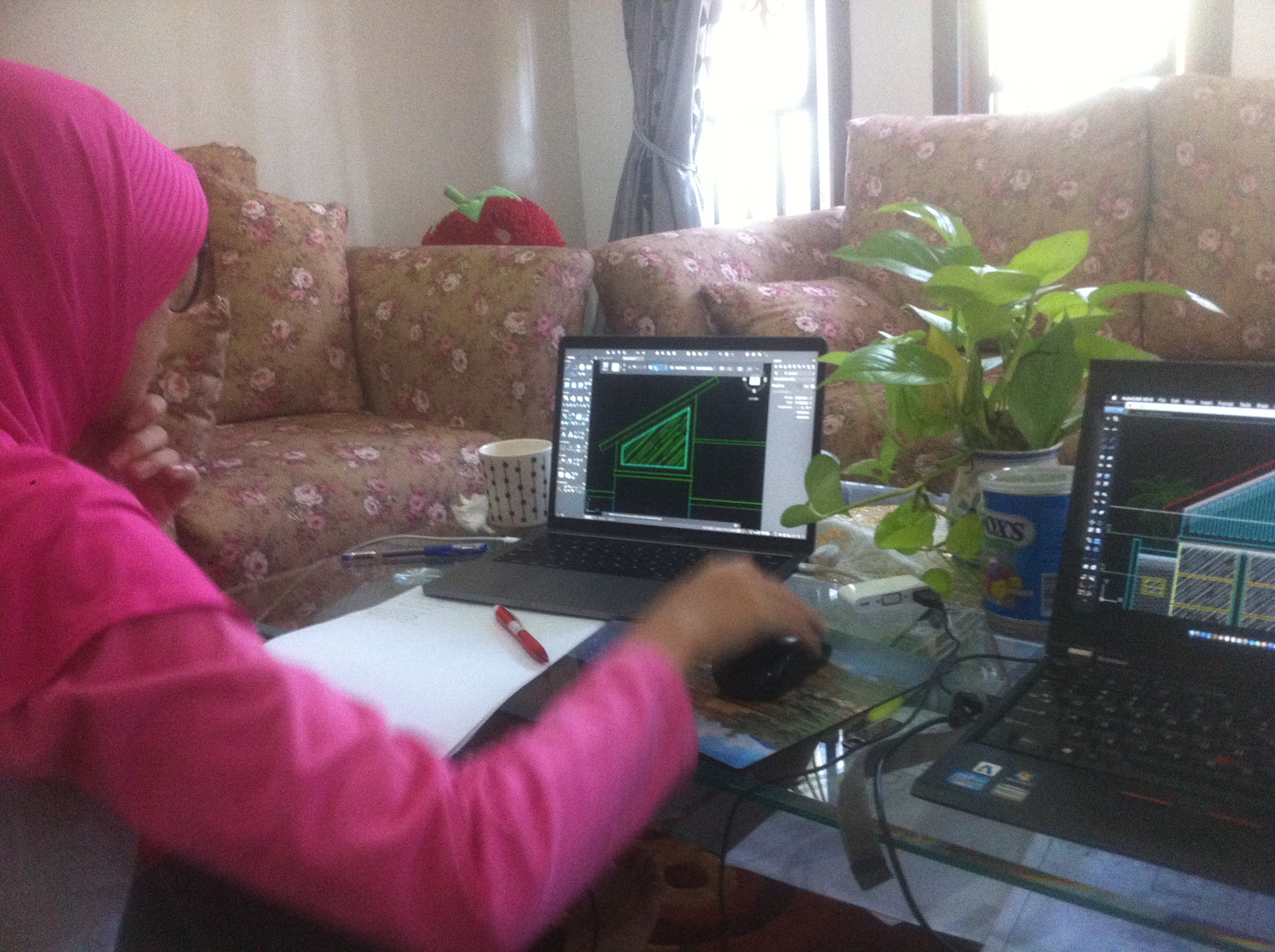 Untuk pertemuan selanjutnya, peserta sudah mulai lancar membuat gambar denah, tampak dan potongan yang dilengkapi dengan notasi serta ketebalan garis. Saatnya belajar mencetak gambar dengan skala yang disesuaikan kertas yang ada.