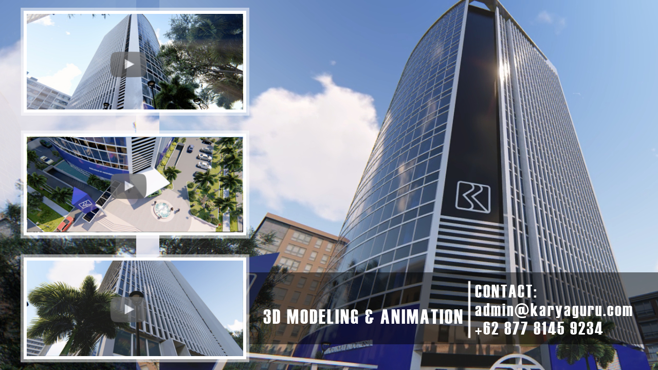 Konsep arsitektur gedung perkantoran ini merupakan draft desain yang dikemas dalam bentuk video 3d animasi untuk mempresentasikan bentuk eksterior fasad bangunannya. Proses Pengerjaannya bekerja sama dengan Bapak Toton Suhartanto selaku arsitek yang memberikan cukup data untuk kami menyelesaikan pekerjaan ini.