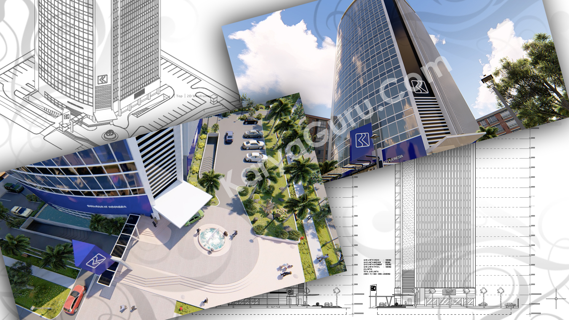 Dari bentuk 2D dan 3D dilanjutkan proses rendering untuk pandangan dari berbagai macam sudut untuk memperlihatkan bagian-bagian bangunan, baik dari posisi bawah, tengah maupun dari posisi atas.