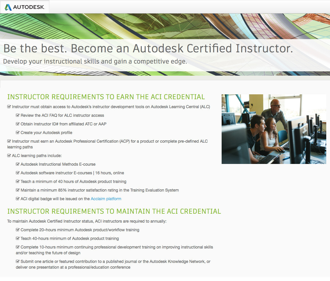 Terdapat informasi sertifikasi bagi instruktur yang mengampuh pelajaran keteknikan menggunakan perangkat lunak (software), yang diakui oleh Autodesk sebagai salah satu vendor perangkat lunak utama saat ini. Kriteria umum dari Autodesk Certified Instructor dijelaskan berikut ini: