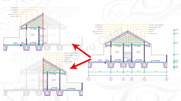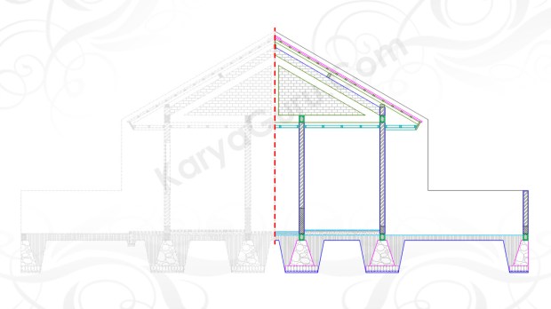 Silahkan gunakan perintah COPY untuk menduplikasi gambar POTONGAN C-C sebanyak 2 buah, kemudian buat garis vertikal dengan perintah LINE atau POLYLINE sebagai acuan dengan posisi tepat di tengah-tengah bangunan. Hapus 1/2 bagian kanan dan 1/2 bagian kiri seperti pada gambar berikut ini: