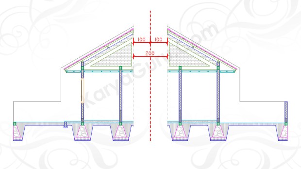 Modifikasi garis DINDING SOPI-SOPI berikut RANGKA ATAP nya hingga menyentuh garis acuan ditengah, seperti pada gambar (warna merah). Anda dapat memanjangkan garis-garis tersebut atau menambahkannya dengan garis baru. Anda dapat gunakan perintah draw seperti LINE atau POLYLINE dan Perintah modify seperti EXTEND, TRIM, STRETCH, MIRROR, COPY dan lainnya untuk menyelesaikan langkah ini.