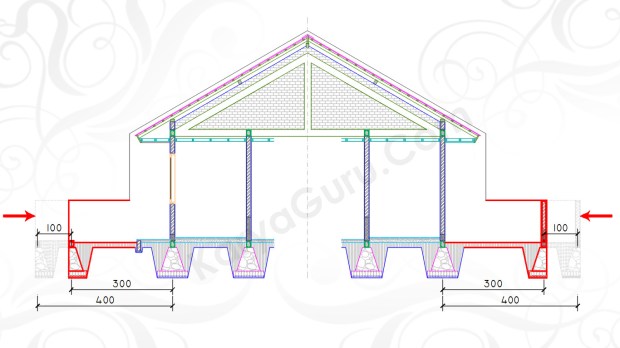 Pindahkan obyek-obyek pada area paling kanan dan kiri seperti obyek PONDASI, SLOOF, DINDING dan garis lainnya berikut arsirannya. Jarak dan arah perpindahan obyek-obyek tersebut sesuai pada gambar (warna merah). Garis untuk level taman belakang disesuaikan dengan level taman depan.