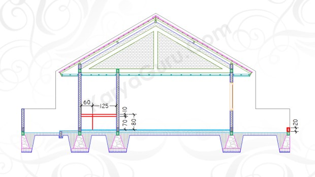 Modifikasi juga garis untuk obyek KUDA-KUDA BETON seperti pada gambar dibawah ini (warna merah). Anda dapat menambahkan garis baru dengan perintah draw seperti LINE atau POLYLINE. Anda juga dapat memodifikasi dengan memanjangkan dan memindahkan garis-garis tersebut dengan perintah modify seperti EXTEND, TRIM, MOVE, STRETCH, MIRROR dan lainnya.