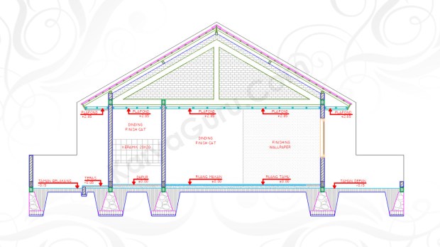 Buat TEKS untuk nama bagian ATAP sesuai gambar pada gambar (warna merah). Lengkapi dengan notasi garis untuk menerangkan obyeknya. Beberapa perintah yang dapat Anda gunakan diantaranya: TEXT, LINE, COPY, MOVE, MIRROR dan lain sebagainya.